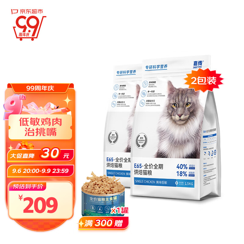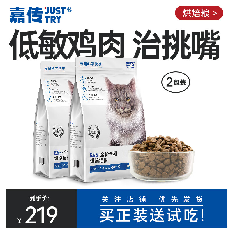 嘉传E65烘焙全价无谷全阶段成猫幼猫单一鸡肉挑嘴克星高蛋白低敏猫粮 3kg 2包装 2包试吃【九成选择】