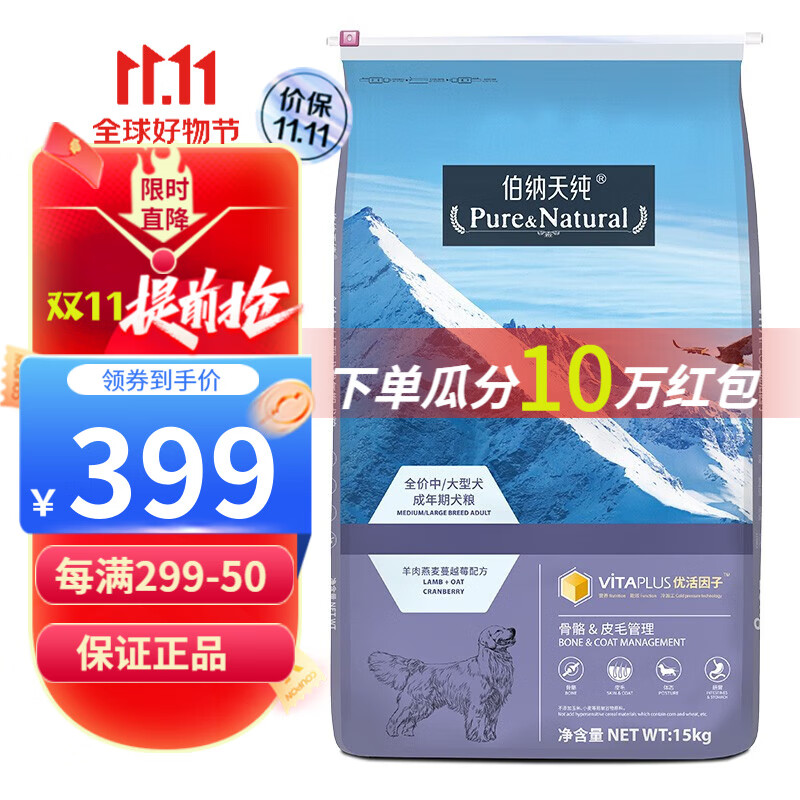 伯纳天纯 狗粮 中大型成犬粮专用天然犬粮羊肉金毛萨摩哈士奇通用博纳天纯 15kg中大型犬成犬