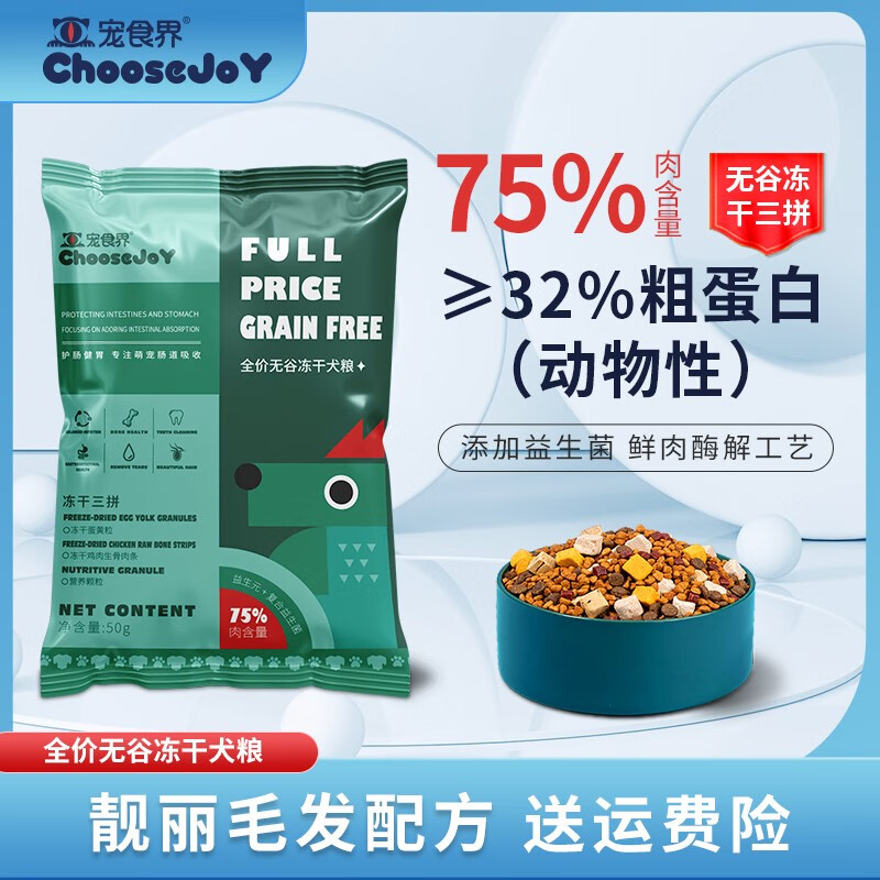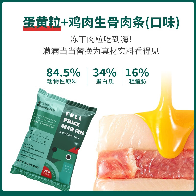 宠食界 全价无谷冻干三拼狗粮金毛拉布拉多阿拉斯加柴犬萨摩耶德牧5kg犬粮宠物成犬 全阶蛋黄鸡肉生骨肉50gx3 成犬