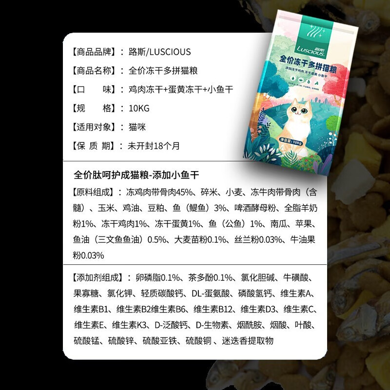 路斯(Luscious)猫粮10kg 全价冻干多拼猫粮 成猫猫粮幼猫猫粮无谷粮冻干粮猫干粮 全价冻干多拼猫粮 10kg*2包