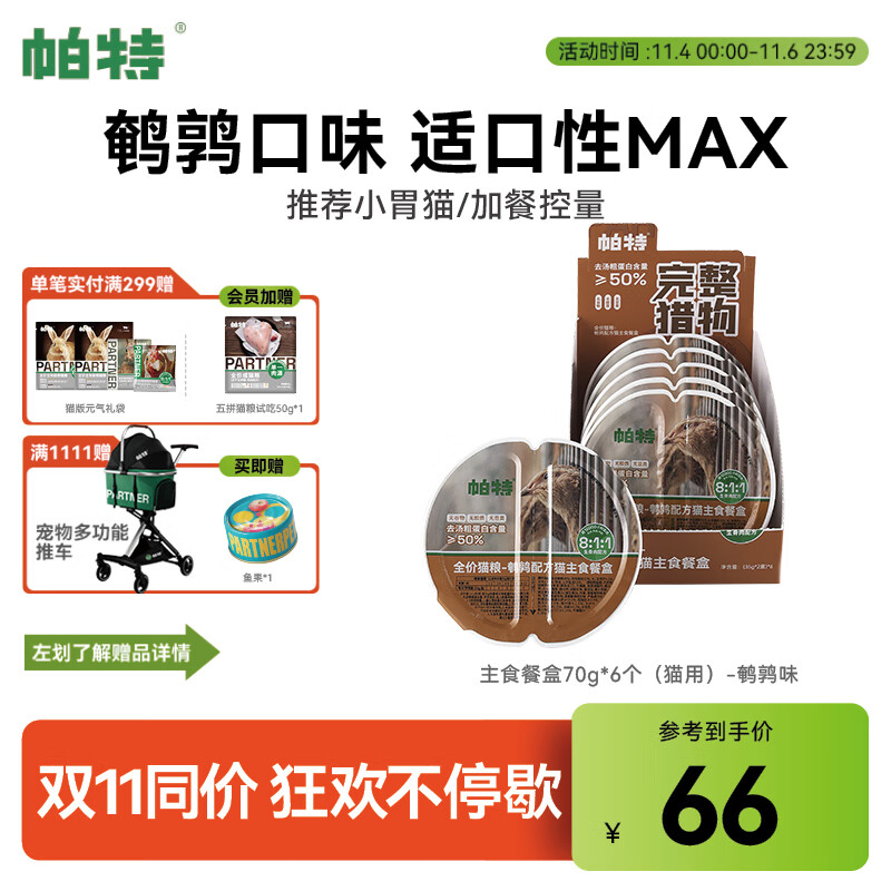 帕特主食餐盒全价猫主食罐成幼猫罐头增肥补水猫咪湿粮70g 鹌鹑 70g*6个