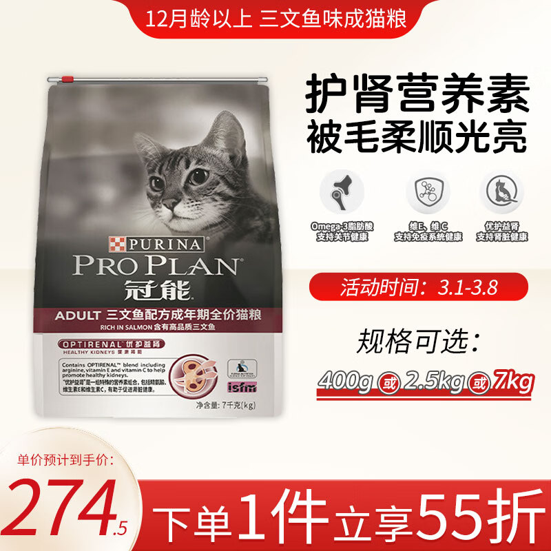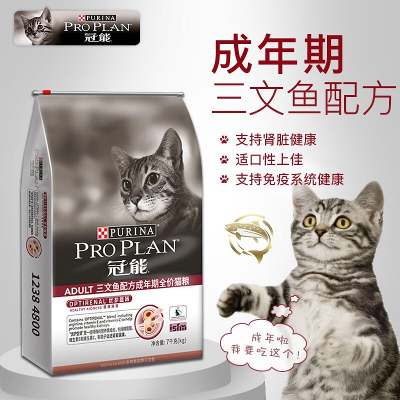 冠能(PRO PLAN)成年期猫粮 英短美短布偶猫粮1岁加 优护益肾 助力成长 成猫7kg/三文鱼味-有效期10.06