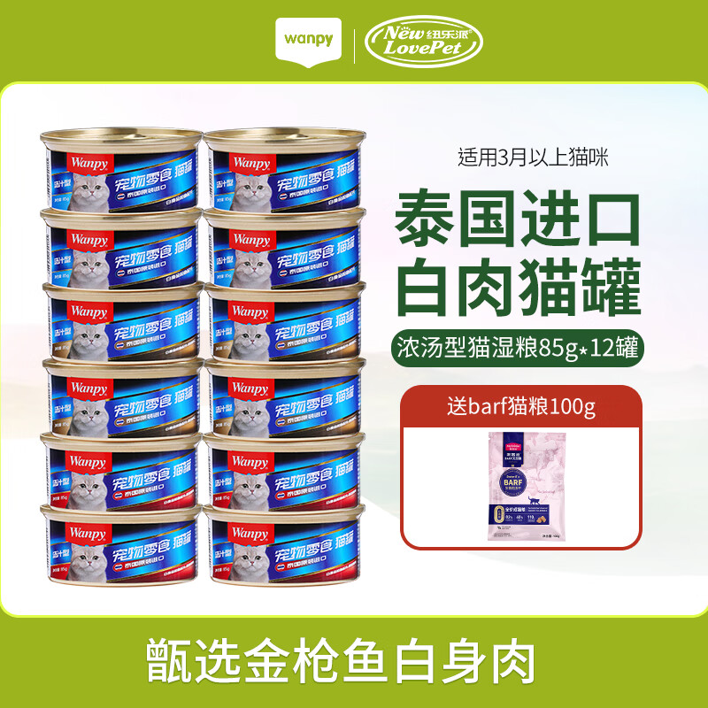 顽皮(Wanpy)猫零食 泰国原装进口白肉猫罐头猫湿粮 浓汤型混合口味85g*12罐
