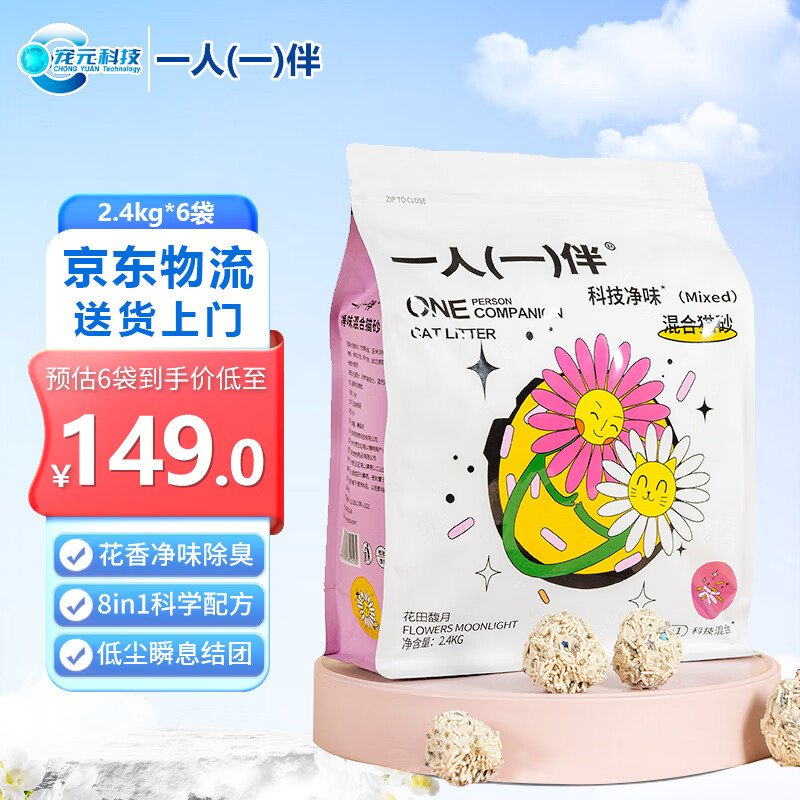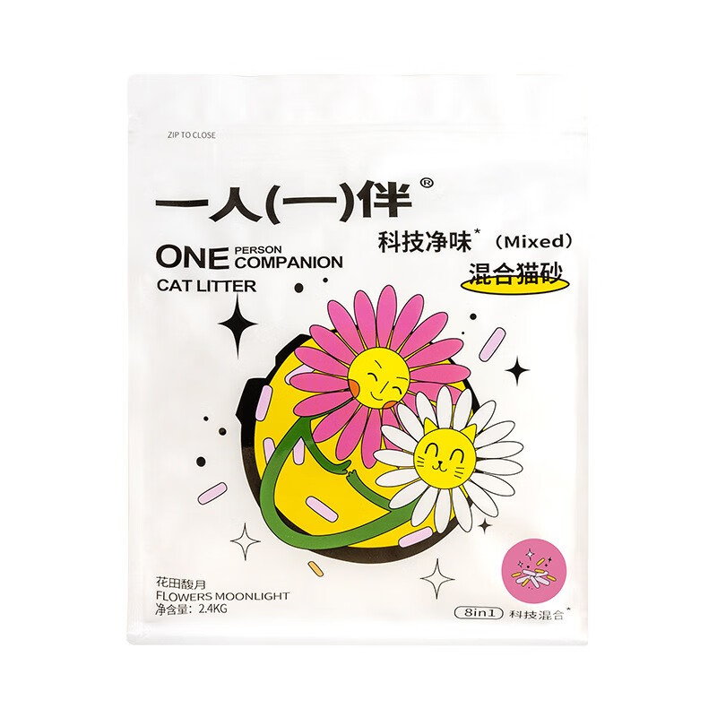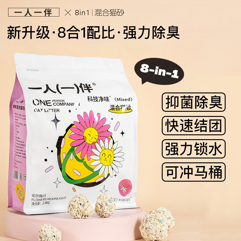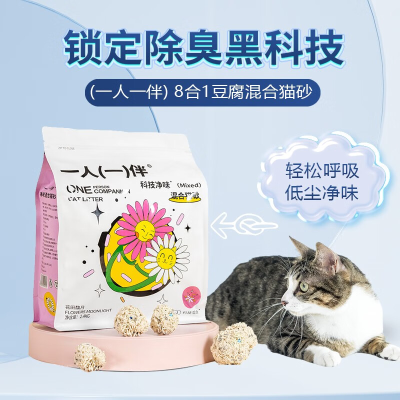 一人一伴猫砂豆腐膨润土混合8in1植物狗沙猫咪除臭结团快清淡花香 【花田馥月】2.4kg*6袋