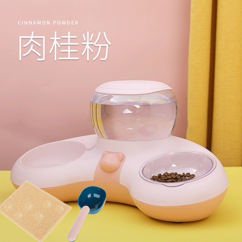 猫碗狗狗碗食盆自动饮水双碗猫咪食碗防打翻狗盆猫粮水碗宠物用品 肉桂粉 餐垫 勺子 全新升级造型犬猫通用