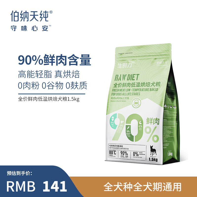 伯纳天纯狗粮生时力0谷全阶段鲜肉低温烘焙狗粮成犬幼犬鸭肉梨配方狗粮 低温烘焙鸡肉鸭肉三文鱼1.5kg