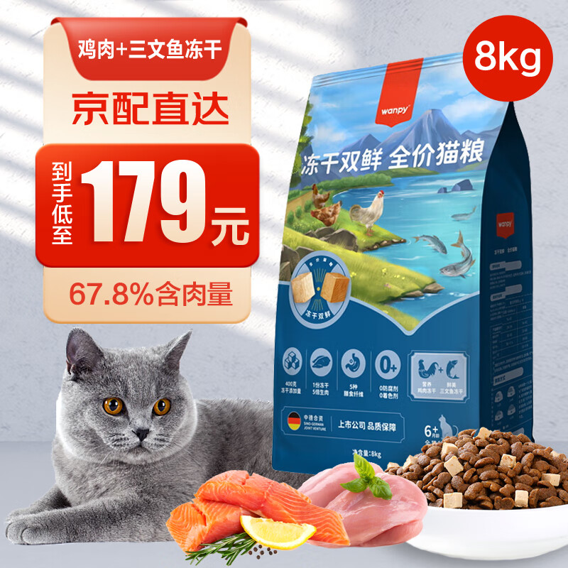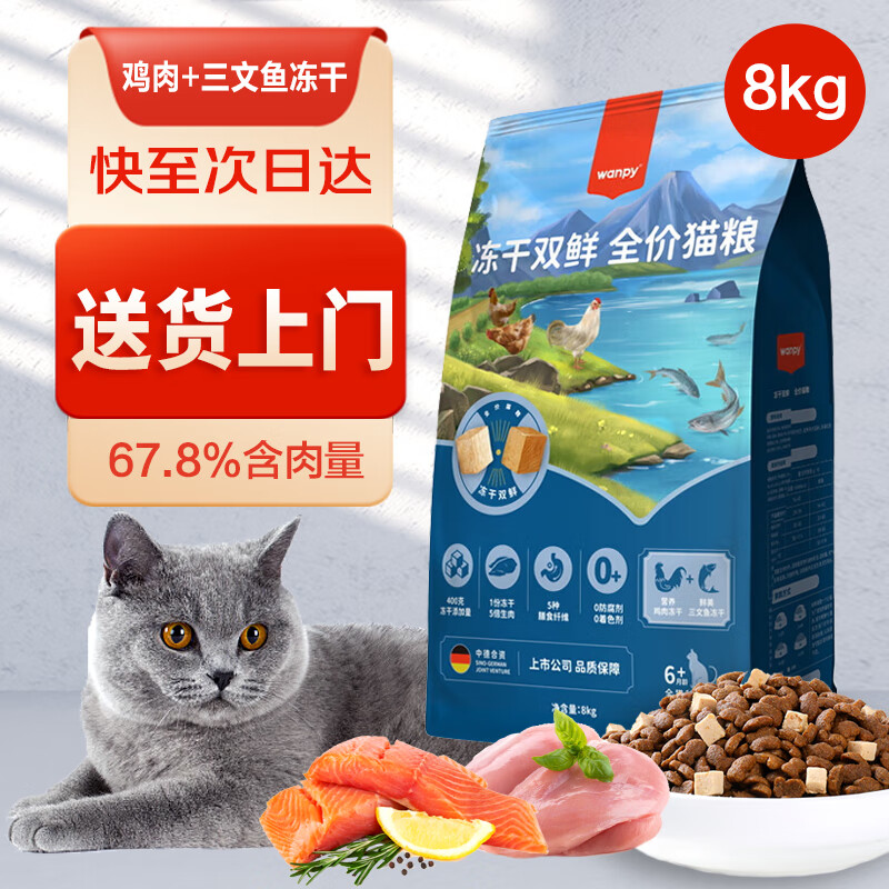 顽皮(Wanpy)猫粮 双鲜猫粮8kg 添加冻干肉粒 双拼全价猫主粮 冻干三文鱼 双鲜粮8kg
