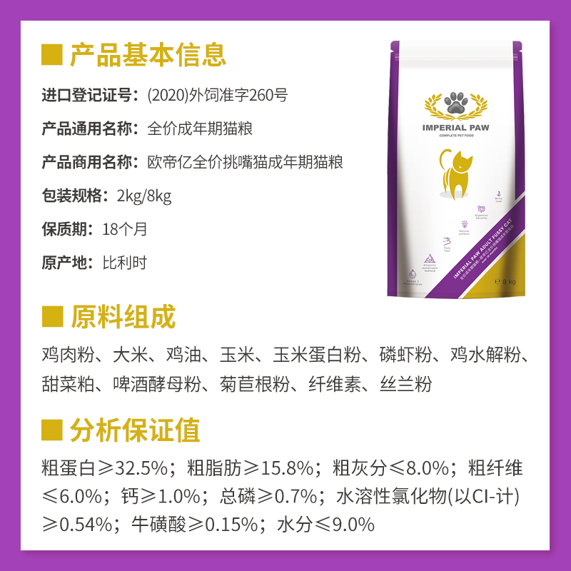 欧帝亿(IMPERIAL PAW)挑嘴成猫猫粮天然粮 全价成年期猫粮2kg布偶橘猫美短英短发腮通用
