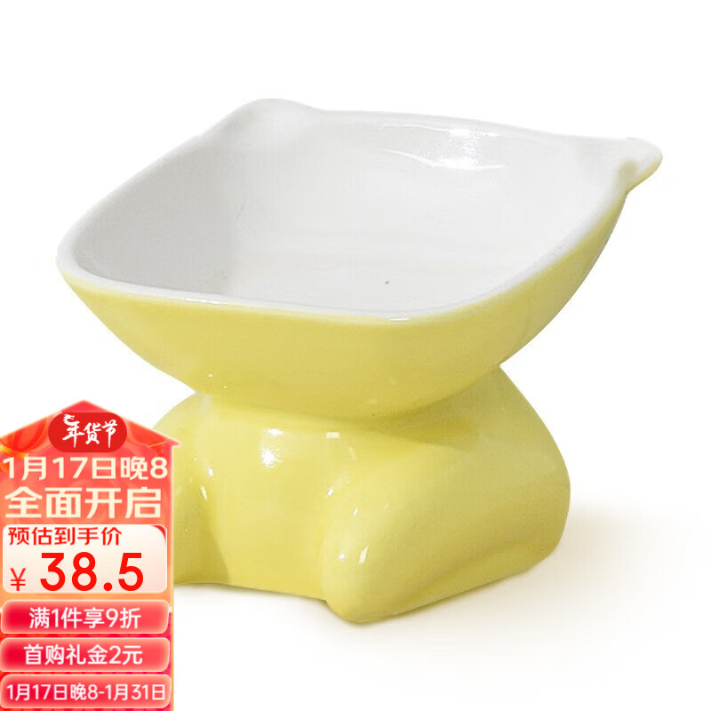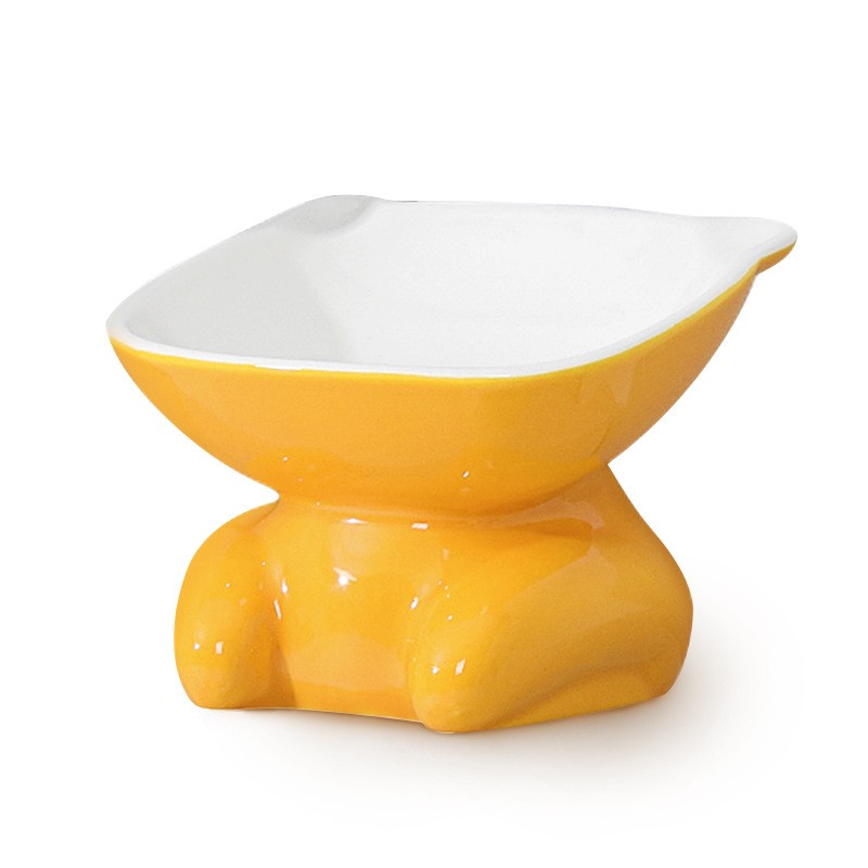 伴笛猫碗陶瓷猫粮碗高脚斜口碗护颈防打翻水碗猫食盆猫食碗猫咪用品 黄色【浅碗】