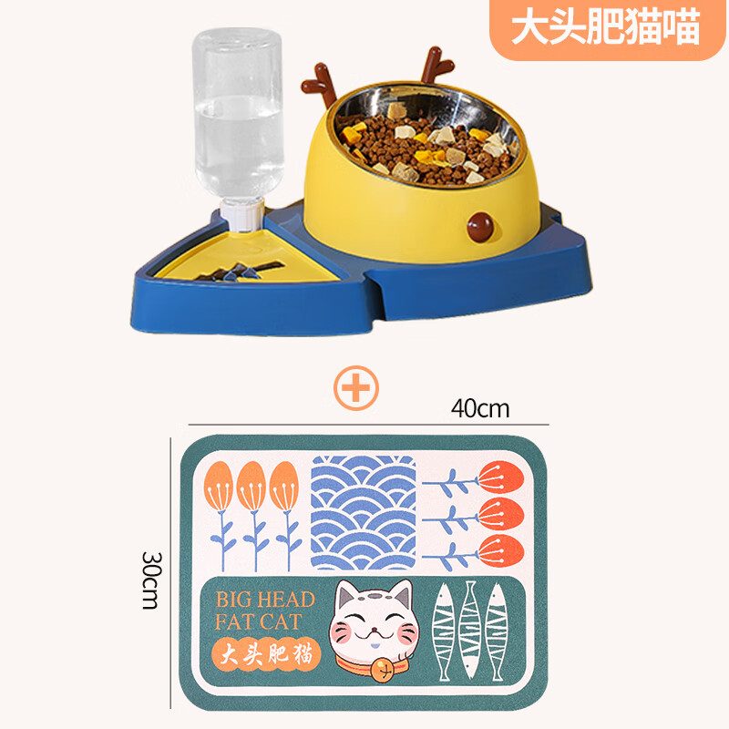 猫碗双碗自动饮水一体狗碗狗食盆护颈椎饭盆喝水狗狗猫咪宠物用品 【黄蓝色】可拆卸不锈钢碗 卡通餐垫【大头肥猫】 自动出水 550ml水瓶 2-3天不加水发货速度快