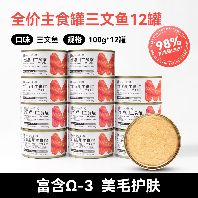 美人喵 猫罐头主食罐猫咪零食成幼猫营养增肥全价猫粮猫条24罐整箱 全价主食罐三文鱼味100g*12罐