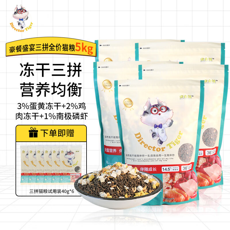 虎主任 冻干猫粮三拼加送6%冻干高肉含量鸡肉味成猫幼猫主粮增发腮肥全阶段 豪餐盛宴5包10斤(贈体验装 鸡肉冻干)
