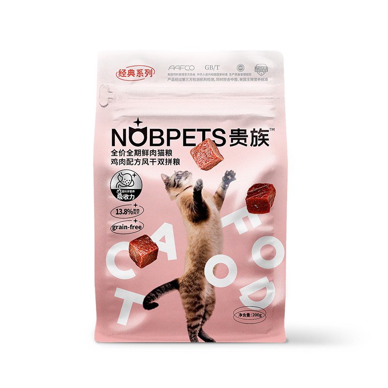 贵族NOBPETS 鲜肉猫粮 成猫冻干生骨肉 95双拼鲜肉粮 全价无谷 成猫/幼猫 奶糕全期猫粮 贵族经典全价全期风干双拼鸡肉猫粮200g