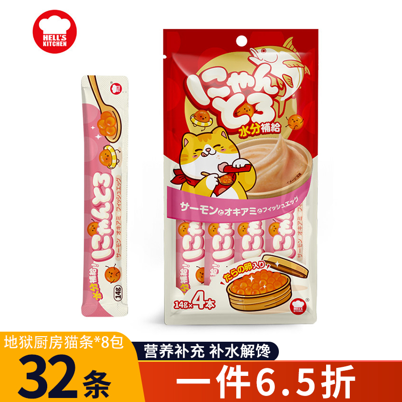 地狱厨房猫条猫零食补水湿粮成猫幼猫营养增肥发腮无诱食剂袋装金枪鱼三文鱼鱼籽味猫酱鲜美 三文鱼磷虾鱼籽*8包(32条)