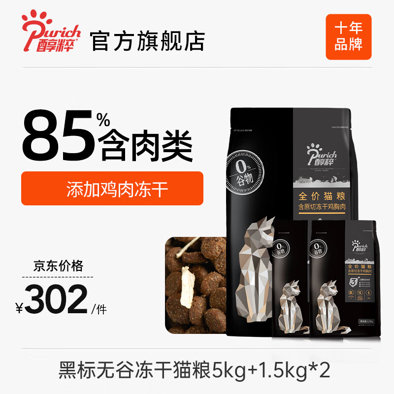 醇粹猫粮黑标 85%肉含量幼猫成猫纯粹全价冻干黑标猫粮无谷鸡肉 鸡肉冻干猫粮8kg (5kg 1.5kg*2)