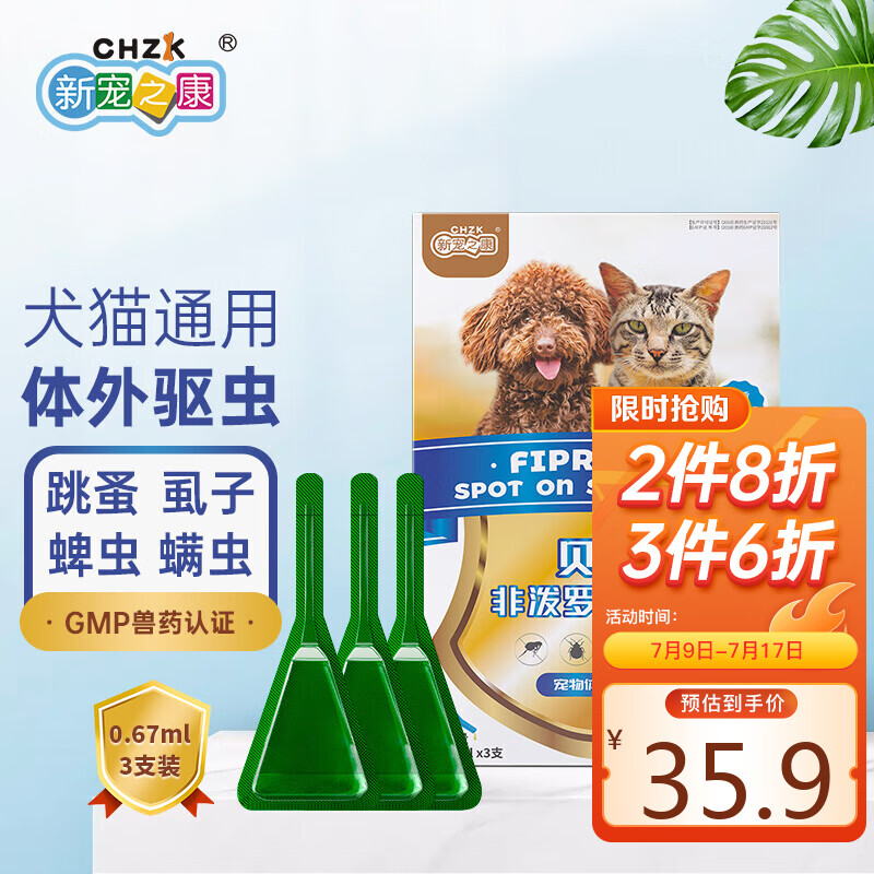 新宠之康 非泼罗尼滴剂犬猫通用0.67ml*3支 猫咪狗狗驱虫药宠物猫体外驱虫滴剂幼犬成犬除跳蚤虱子蜱虫药