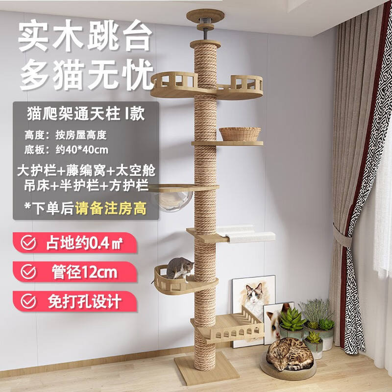 七友【实木PVC】猫爬架通天柱小户型带窝太空舱猫树实木大型柱立式猫玩具猫抓板黄麻磨爪器柱一体猫咪用品 【H款PVC】全家福