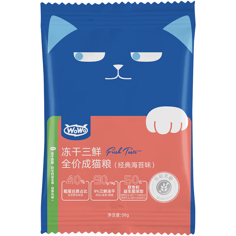 喔喔(WOWO)猫粮 猫主食冻干三鲜全价猫粮成猫粮0谷物猫咪主食猫干粮 【升级款】海苔味 50g试吃