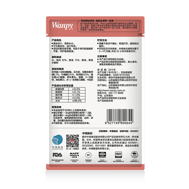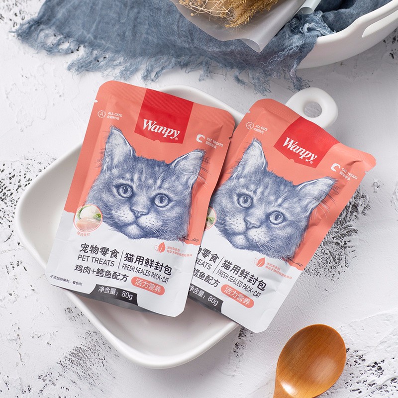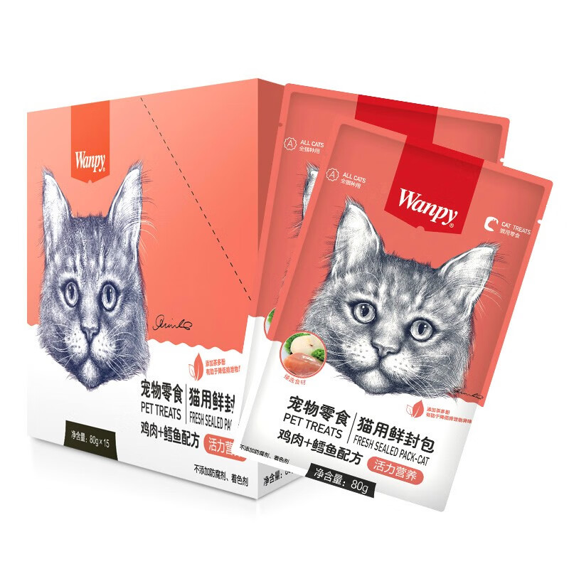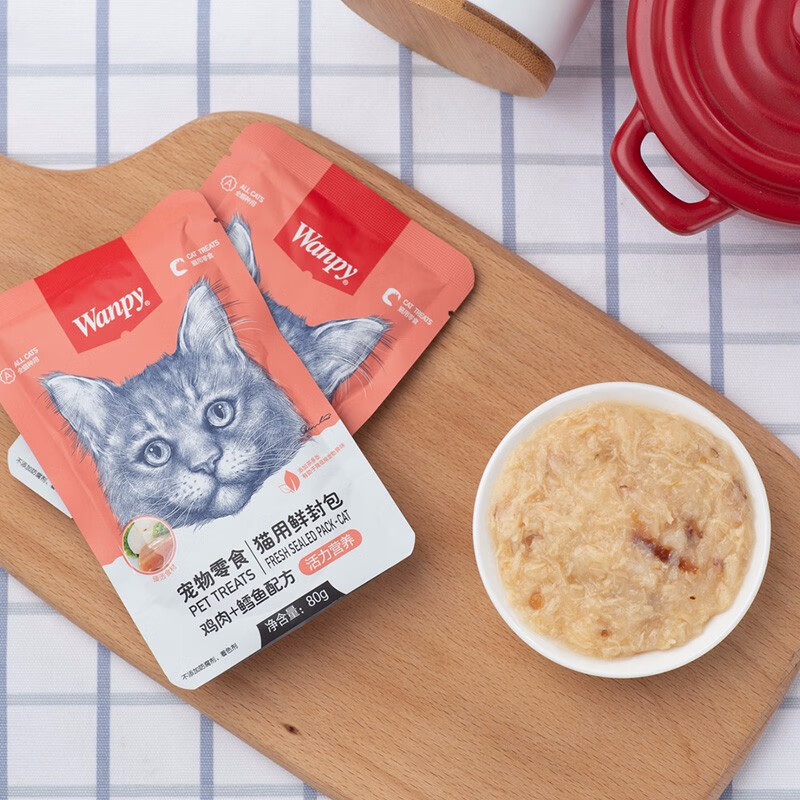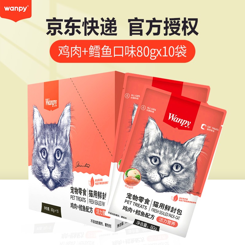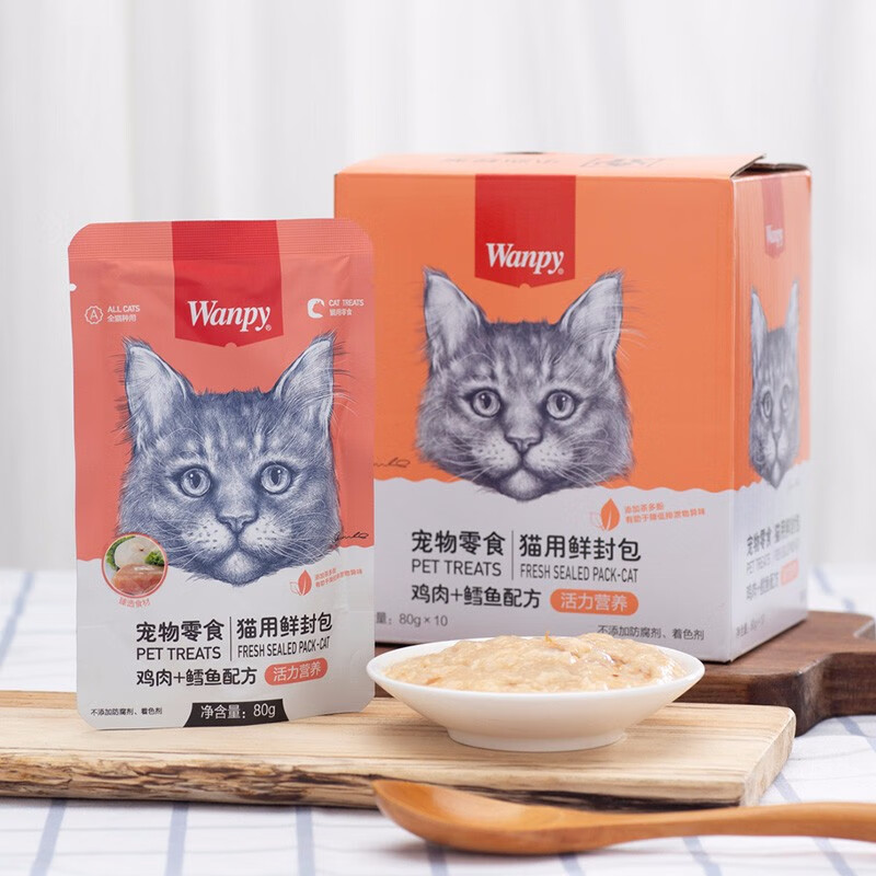 顽皮(Wanpy)猫咪鲜封包 宠物猫粮肉粒包 猫湿粮猫罐头整盒装 鸡肉 鳕鱼 80g*10袋
