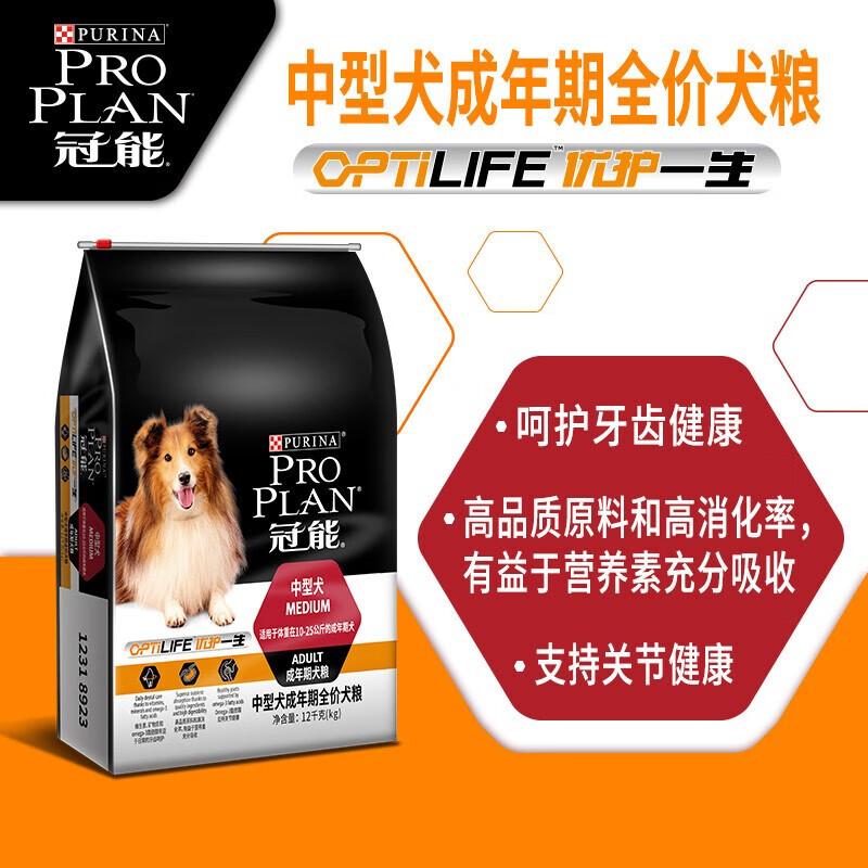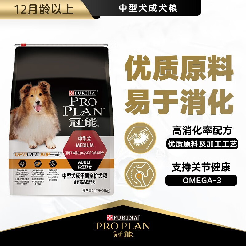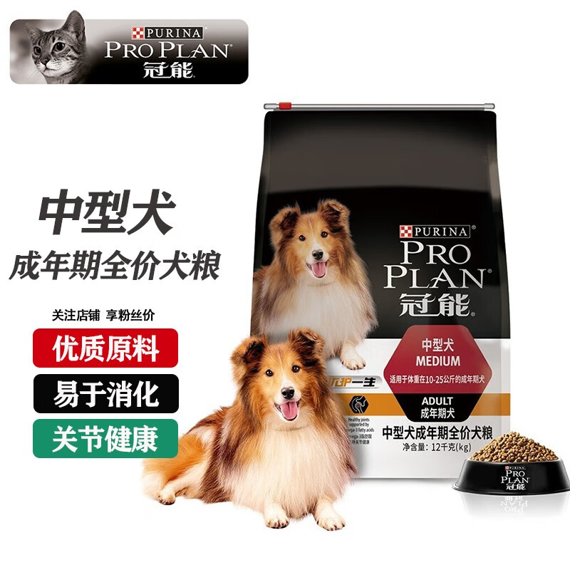 冠能(PRO PLAN)狗粮 中型犬 成犬幼犬狗粮 高消化吸收 呵护牙齿关节 成犬粮 12kg