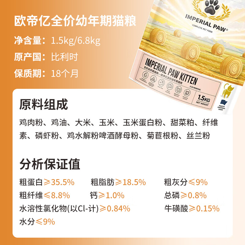 欧帝亿(IMPERIAL PAW)幼猫猫粮天然粮 全价幼年期猫粮发腮 1.5kg 布偶橘猫美短英短