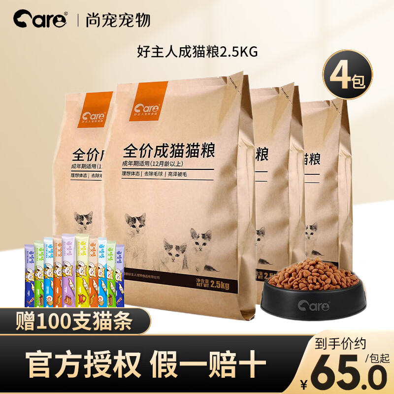 好主人(CARE)猫粮2.5kg 成猫猫粮幼猫猫粮金装全价冻干猫粮无谷粮猫干粮猫主粮 【经典成猫】2.5kg*4包