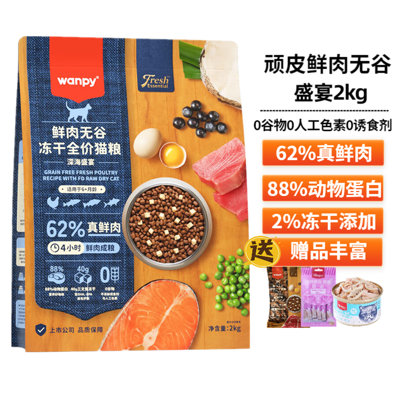 顽皮(Wanpy)猫粮鲜选62%真鲜肉无谷冻干高蛋白全价猫主粮成猫幼猫粮 深海盛宴2kg【23年2月生产】