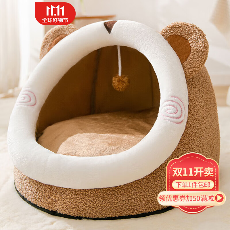 嬉皮狗猫窝四季通用半封闭式狗窝猫床别墅可拆洗狗狗床冬季保暖宠物用品 咖色小熊【经典款】 大号-【15斤内猫狗】超大空间